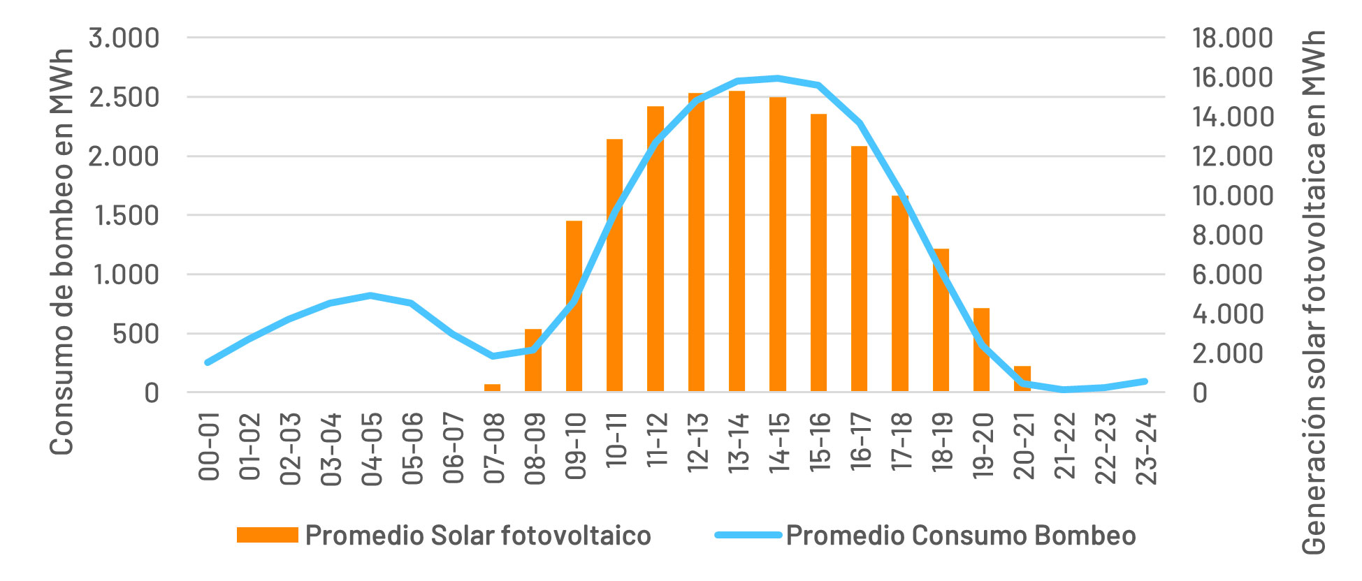 En el siguiente gráfico, se muestran los valores medios horarios anuales del consumo de bombeo y la demanda media horaria. Actualmente, si bien hay consumo de bombeo durante las horas valle, su mayor consumo se realiza en las horas centrales del día, cuando la demanda ya no es tan baja. Se puede observar que el máximo consumo se realiza ahora entre las 9 y las 21 horas.